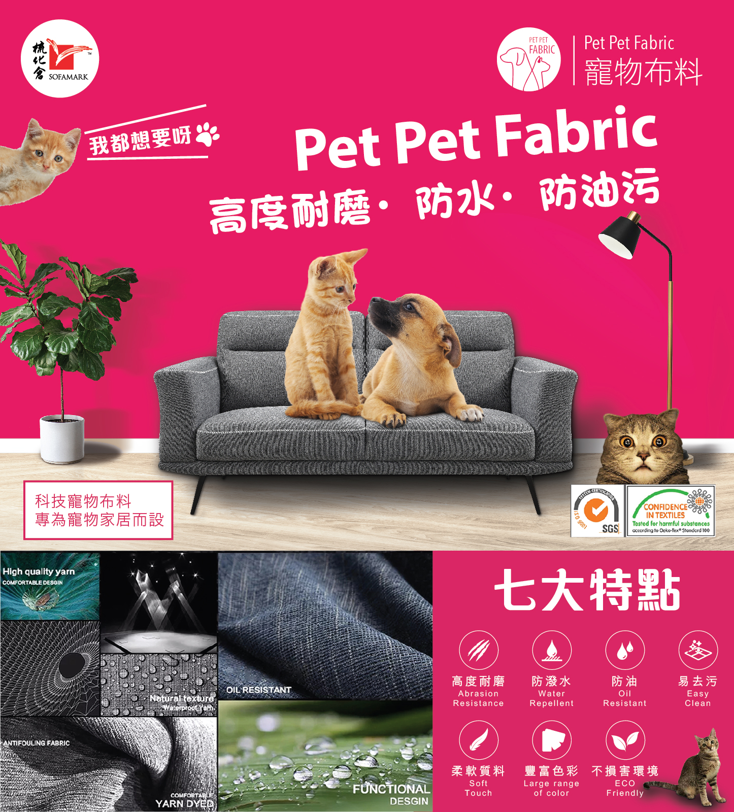 - 寵物布料,具備高度耐磨及防水防污等7大功能